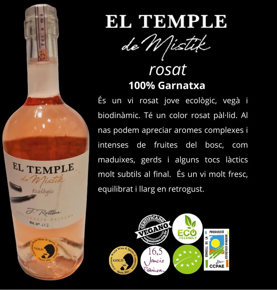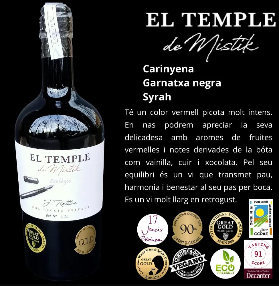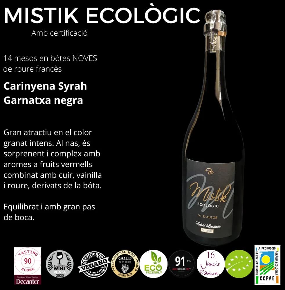Us presentem el nostre tercer celler sense DO, on elaborem els vins d'autor amb certificació ecològica, vegana i de venda de proximitat. A més, esperem tenir ben aviat la certificació biodinàmica. Per això presentem els nostres vins Mistik Ecològic amb certificació. Tot el procés d'embotellament i etiquetatge és manual. Produccions molt limitades. Per això totes les ampolles són numerades. Treballem amb la màxima cura a les nostres instal·lacions.
