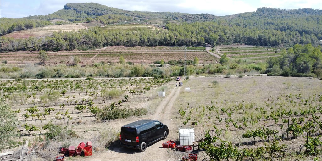 Os mostramos nuestros viñedos ecológicos de más de 50 años de Garnacha y Cariñena, y de 35 años de Cabernet S. Que tenemos en DOQ Priorat, concretamente en la localidad de El Molar. En medio de los viñedos tenemos nuestra bodega para que nuestros clientes puedan degustar nuestros vinos rodeados de cepas, con vistas del Montsant, los árboles, los suelos de pizarra, y el río Siurana que pasa frente a la finca. Los adobos que utilizamos tienen certificado ecológico. La bodega es ecosostenible y funciona con energía solar y eólica. Además recuperamos el agua de la lluvia y reciclamos el 99,6%. En la fotografía verá que todo el proceso se realiza de forma manual y nuestras producciones son muy pequeñas, trabajamos con pasión todo lo que hacemos, hasta conseguir unos vinos de mucha calidad. En el campo trabajamos con el chapo como verá en las fotografías para sacar las malas hierbas alrededor de la cepa.